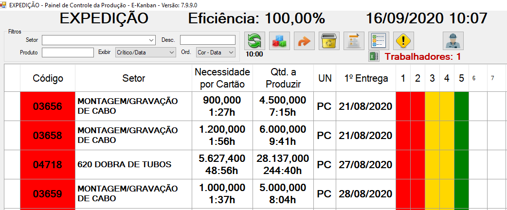 grade do painel de controle da produção E-Kanban de acordo com os filtros acima.