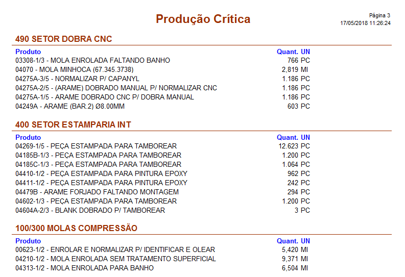 Apresenta no relatório a informação do setor onde são fabricados e a quantidade mínima que precisa ser produzida para sair da Critícidade.