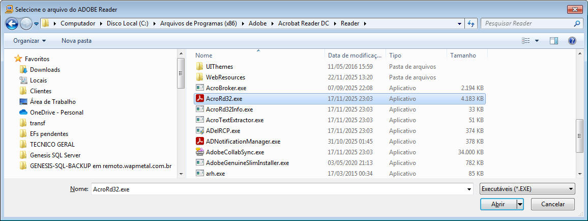 Clique no ícone na tela de Faturamento em Lote e localize e selecione o programa AcroRD32.exe