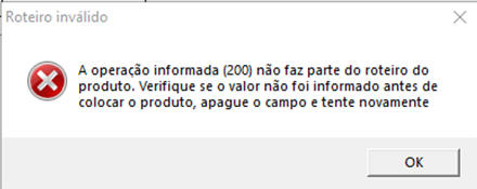 20. Caso exista Roteiro no Produto e a Operação do Apontamento não fizer parte do Roteiro o sistema não permitirá salvar e dará mensagem: