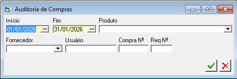 Objetivo - Exibir os registros de inclusão, exclusão e alteração de todo ciclo de compras (requisição, cotação, pedido, entrada e devolução). Esta opção depende do parâmetro Auditoria da configuração