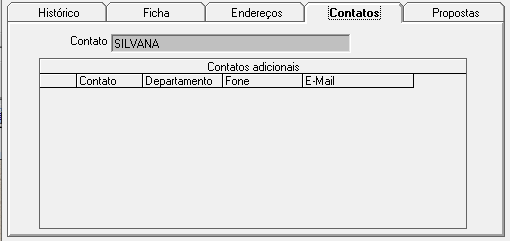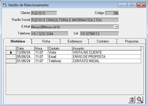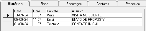 Apresenta os registros de contatos mantidos com o cliente, com data, hora, tipo do contato,  permite programar a agenda dos próximos contatos.