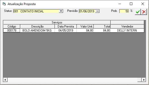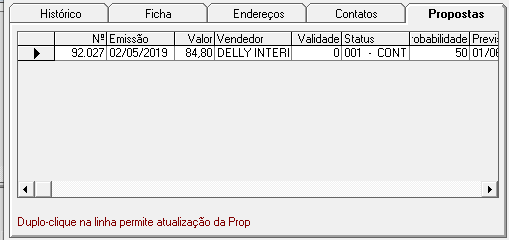 Um duplo clique na linha da proposta abre a tela de atualização da proposta (Status, Previsão e Probabilidade de Fechamento):