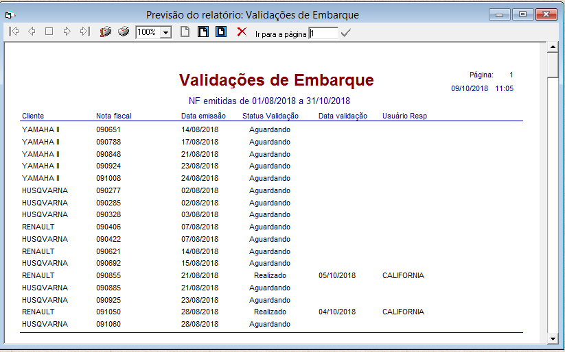 2. Quando embarque Validado, apresenta no relatório a NF com o status "Validada".