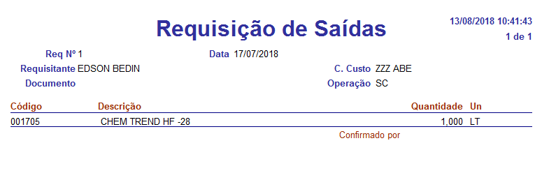 Apos a confirmação teremos a indicação na Requisição de Saída, do responsável pela confirmação e a movimentação de estoque (baixa) com a operação de estoque RM (requisição de materiais).