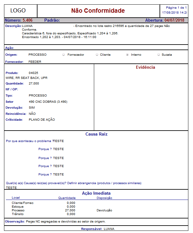 Aberto por: Identificação do responsável que abriu a NC.