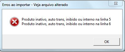 - Não permite a importação de itens inativos, interditados, item com inibe vendas marcado, ou grupo de estoque de uso interno. Nestes casos apresenta mensagem indicando o(s) itens.
