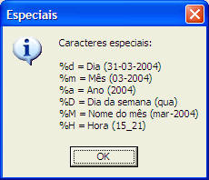 Nome Backup: Nome do arquivo zipado (.ZIP) que irá conter os dados do backup. O botão ao lado mostra os caracteres especiais "coringa", usados para formar o nome do arquivo .ZIP.