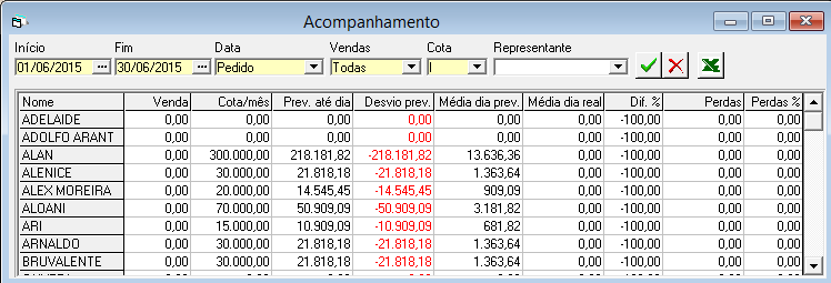 Objetivo: Acompanhar as vendas realizadas pelos representantes com as cotas definidas no cadastro de vendedores. A grade exibe todos representantes mesmo sem vendas.