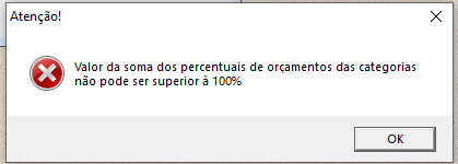 A soma dos percentuais indicados das categorias, não pode ser superior a 100%, apresenta mensagem. Neste caso reavaliar os percentuais.