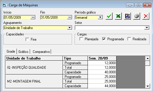 Objetivo - Gerar grade e gráficos das cargas planejadas, programadas e realizadas nas Unidades de Trabalho (UTs) no período informado.