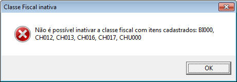 Nota: Caso usuário tente Inativar uma classe fiscal com itens ligados a ela, o sistema dará aviso e mostrará os códigos de itens da Classe Fiscal e não permitirá Inativar a classe.