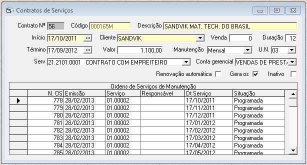 Manutenção: Período em meses de manutenção do contrato: Mensal, Bimestral ou Trimestral. Usado na geração das O.S.s