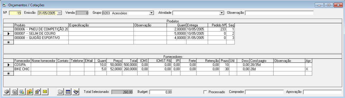 Orçamento: Emite orçamento de compra p/ envio aos fornecedores em formato Word. O Genesis imprime uma folha para cada fornecedor com todos os produtos em cotação. O modelo do orçamento pode ser configurado pelo usuário em Word, como "cotação.dot". Modelos de formulários e a lista de campos pré-definidos na integração Genesis-Word pode ser encontrada no endereço FTP da Flexsys: