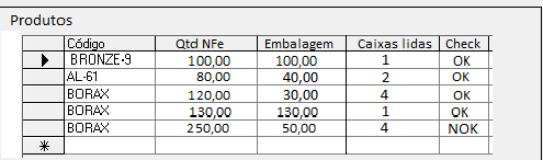 Check: OK ou NOK, indicado para cada produto mencionado na grade, resultado da validação das quantidades Volume NF x Volume Lido