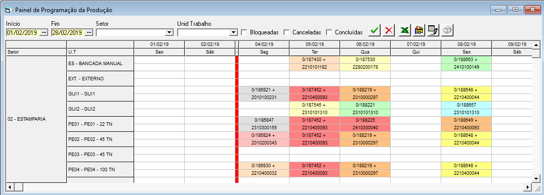 Objetivo - Programar / Reprogramar a produção por meio de painel (Gráfico de Gantt), que apresenta as OPs abertas (Emitidas, Em Produção) no período. As OPs são ordenadas por setores e unidades de trabalho (ou Grupo de Máquina e Código da Máquina). Um duplo clique sobre a OP mostra os detalhes da ordem.