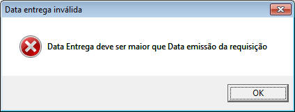 2. Não permite salvar caso Data de Entrega menor que a Data Emissão, exibe a mensagem abaixo.