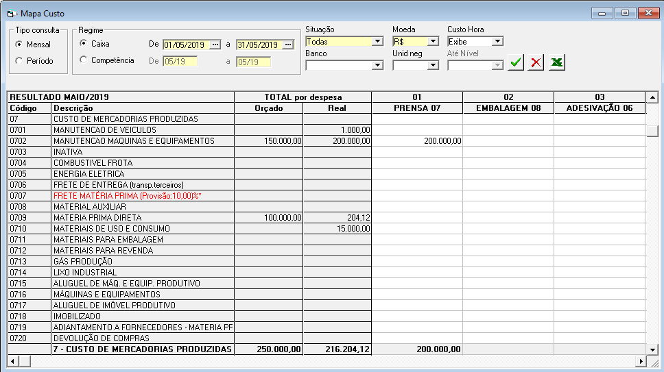 1. Os resultados apresentados nas colunas "Total por despesa" "Orçado" "Real" são o resultado gerencial das contas e centros de custos baseados nas contas gerenciais cadastradas nos produtos e grupos de estoque.