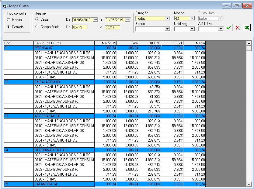 Cálculo: (Total da conta gerencial / Total do centro de custo ) *