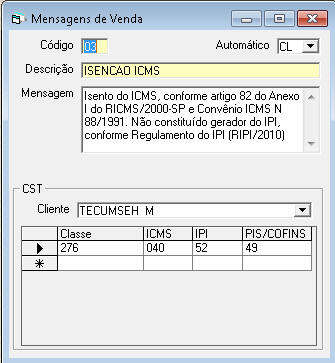 Os campos da grade são para restringir o tipo de operação que deverá ir a mensagem da venda. No exemplo abaixo, a mensagem só será colocada na venda para o cliente TECUMSEH, com itens da classe 276 e cuja CST ICMS = 040.
