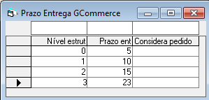 Prazo: Prazo de entrega em dias corridos caso haja estoque disponível no nível. Observe que os prazos devem crescer para níveis crescentes, por exemplo: