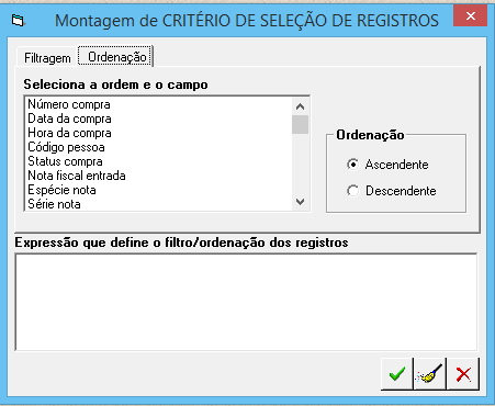 Ordenação: Permite ordenar por Compra n°, ou por Fornecedor ou por Entrada.