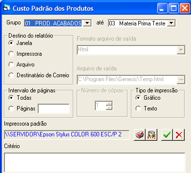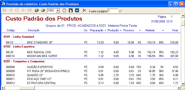 Objetivo: Emitir relatório que apresenta o custo padrão dos produtos de um ou mais grupos do estoque. O custo padrão é obtido através da estrutura de cada produto e de seu roteiro de produção.