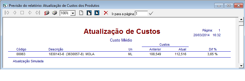 O relatório apresenta somente os produtos com divergências (custos alterados), indicando o percentual da diferença, conforme modelo abaixo: