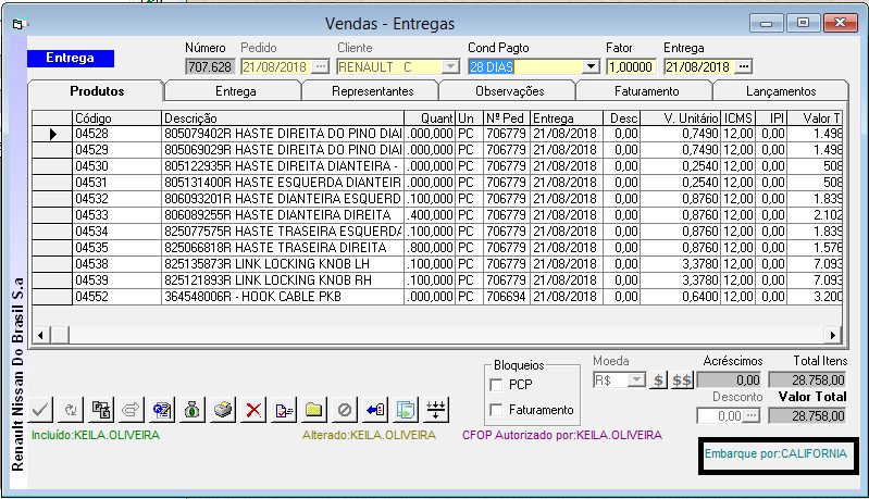3. O usuário responsável pela validação é apresentado na referente Venda Entrega - rodapé.
