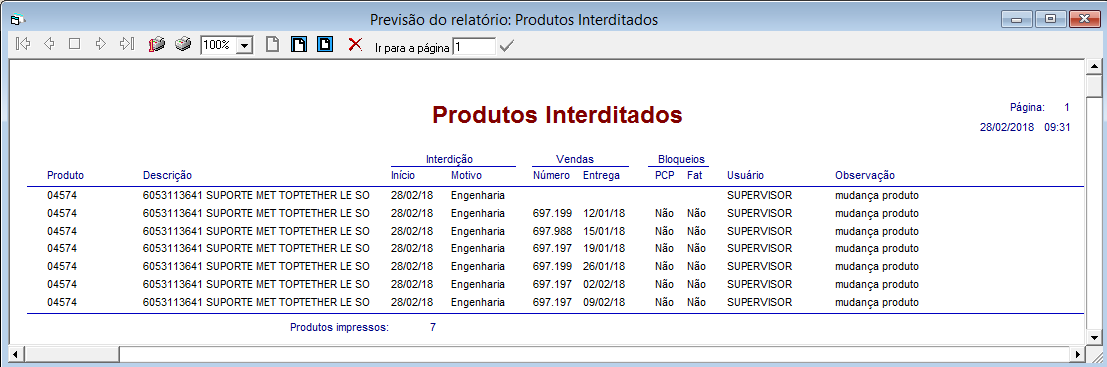 Objetivo - Emitir o relatório que apresenta os produtos interditados e desinterditados, pela engenharia ou diretamente no cadastro de produtos.