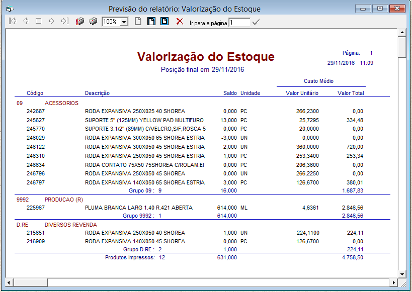 Objetivo - O relatório valoriza os estoques por Custo médio, custo de reposição, preço de venda ou custo padrão.custo de reposição, custo médio, preço de venda ou custo padrão. Os produtos são ordenados por grupos de estoques. A valorização pode ser na data atual ou retroativa. Neste caso, o Genesis recupera os valores na data digitada.