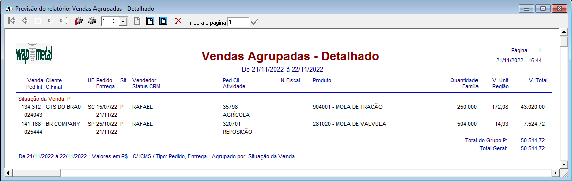 Objetivo - Emitir o relatório de vendas com opções de agrupamento como, por exemplo, produto, cidade do cliente, situação da venda, etc.