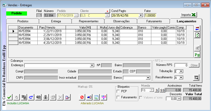 Obs: Após confirmação, o nome do último usuário que alterou o registro, é gravado junto com o nome do usuário que incluiu a venda.