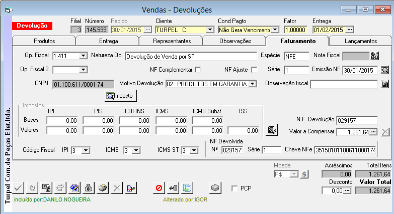 Devoluções - Quando o acesso é feito por meio das opções Vendas / Devoluções a tela tem campos adicionais: