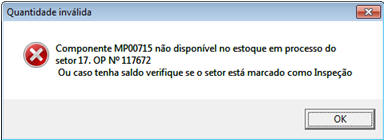 4. Caso parâmetro Verifica estoque em processo marcado e tenha saldo em processo, porém o saldo não está com o número da OP que está sendo apontada, ou caso setor marcado como Inspeção o sistema da mensagem: