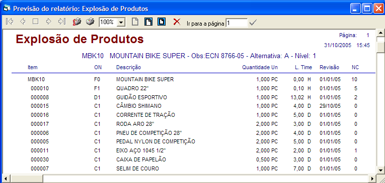 No cabeçalho são apresentados os campos: Código do produto, descrição, observação da estrutura, alternativa e nível. Nos detalhes são apresentados os campos: