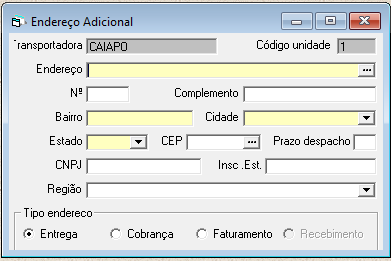 Endereço: Pode ser digitado ou obtido através do botão ... após digitar o CEP. Neste caso o endereço, bairro, cidade e estado são automaticamente preenchidos. O botão + abre tela para cadastrar Endereços Alternativos.