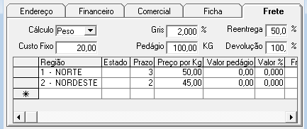 Os campos desta guia são utilizados para o cálculo do valor do frete das entregas destinadas à transportadora para as regiões e estados definidos na grade. O cálculo pode ser disparado pelo botão Frete da venda e refeito na grade de confirmação de entregas.