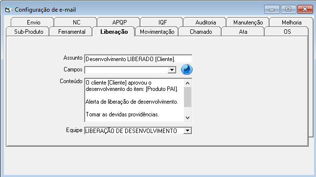 Conteúdo: Conteúdo do E-mail. Os campos selecionados serão substituídos pelo conteúdo correspondente da manutenção.