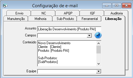 Assunto: Impresso no campo "Assunto" do Outlook. Aceita campos entre colchetes definidos abaixo. Permite utilizar campos variáveis definidos em Campos abaixo.