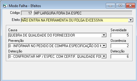Prevenção: Indicar a prevenção para esta falha, das que estão cadastradas em APQP / Cadastros / Prevenção.