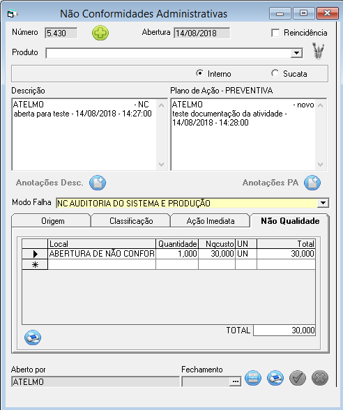 Total: Calculo quantidade x Nqcusto. Esta informação será utilizada no Relatório Estatística Não Conformidade.