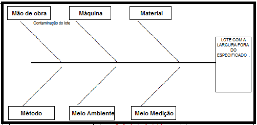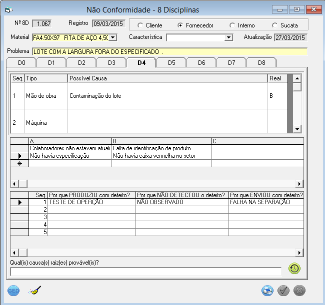 Estas informações são apresentadas no Relatório 8D - Espinha de Peixe grade 1 (Mão de Obra, Maquina, Material, Método, Meio Ambiente e Meio Medição).