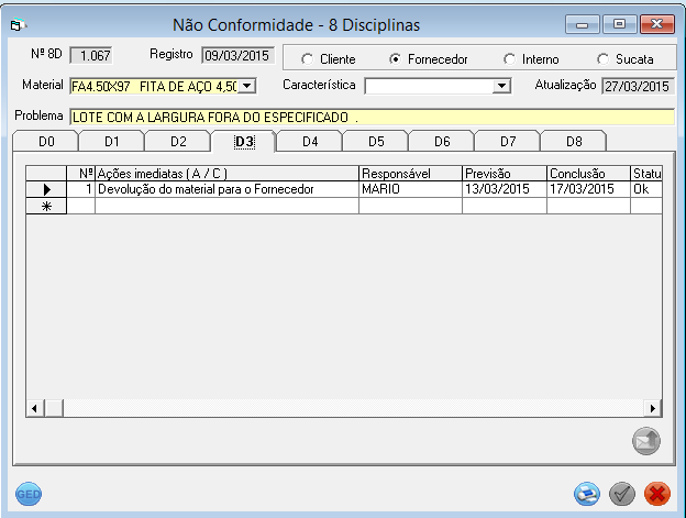 Disposição: Identificar a ação a ser realizada, considerando as opções existentes ( Desvio, Seleção, Retrabalho, Sucata, Devolução ou N/A).